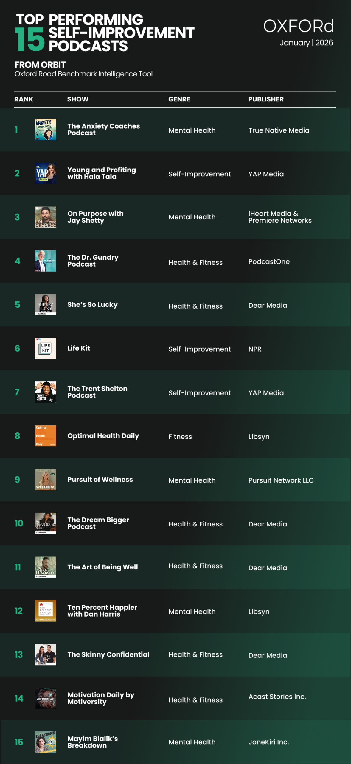 To better understand the marketplace’s New Year’s resolution surge, we analyzed the top-performing “Self-Improvement Podcasts”, which we categorized as shows focused on health & fitness, mental health, professional growth, and/or consumer-facing health science.